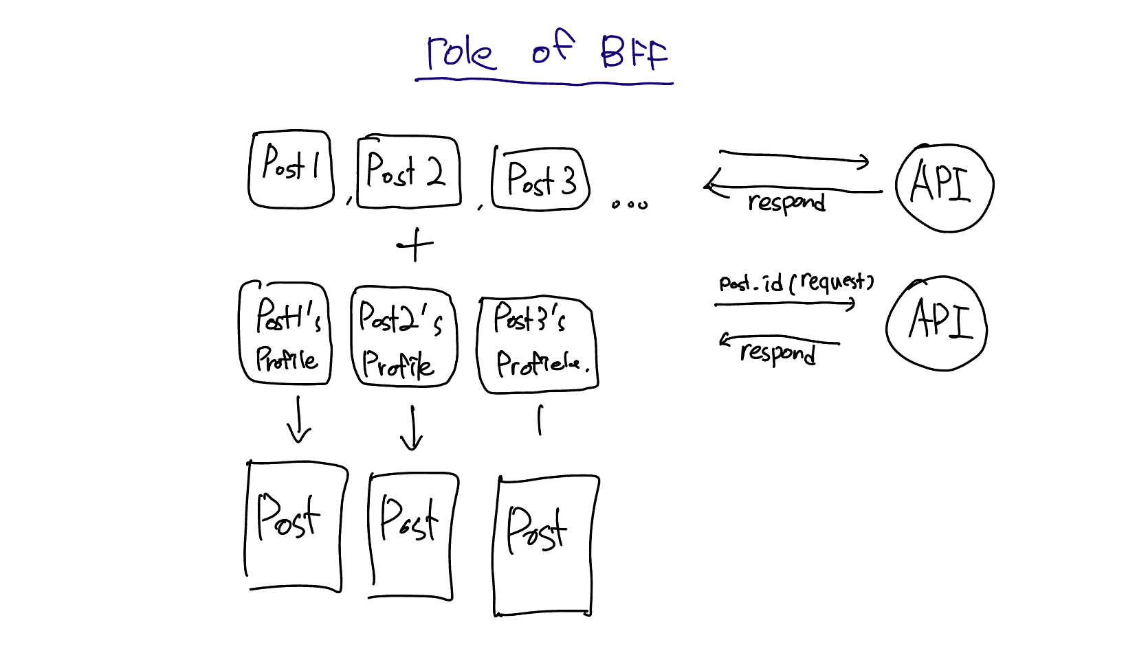 Using BFF in a blog platform, let's consider the listing of posting information. BFF redefines the Post domain by combining Post (title, thumbnail, summary) and Profile (blogger image, blogger name) from the API.
